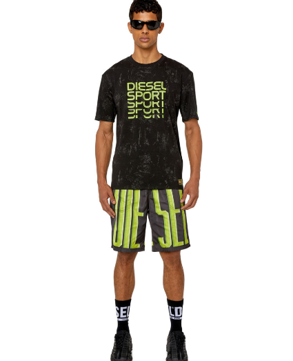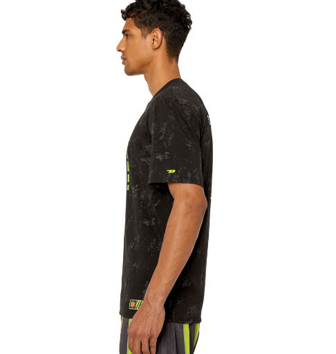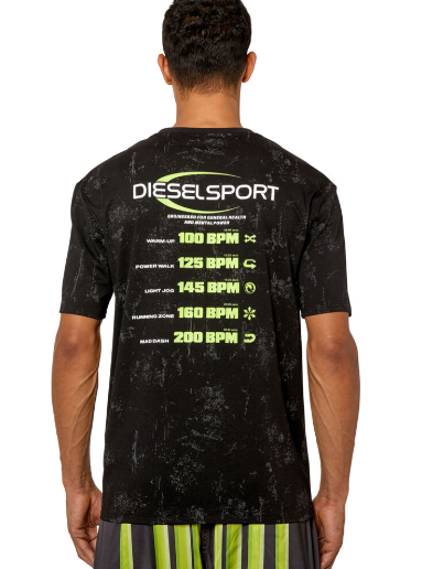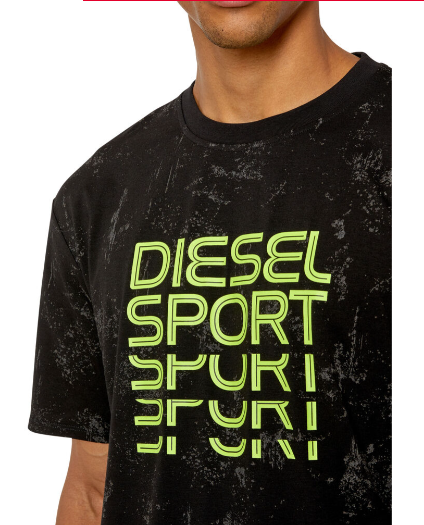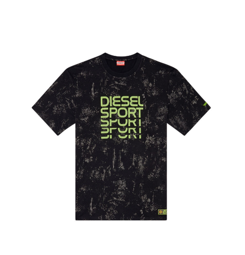 This men's T-shirt is made from a stretchy, sweat-wicking cotton blend and is part of the DIESEL SPORT edition. Silver and black graphics create a worn-in look. It features glitch-style lettering and an embroidered 'D' logo on the sleeve.